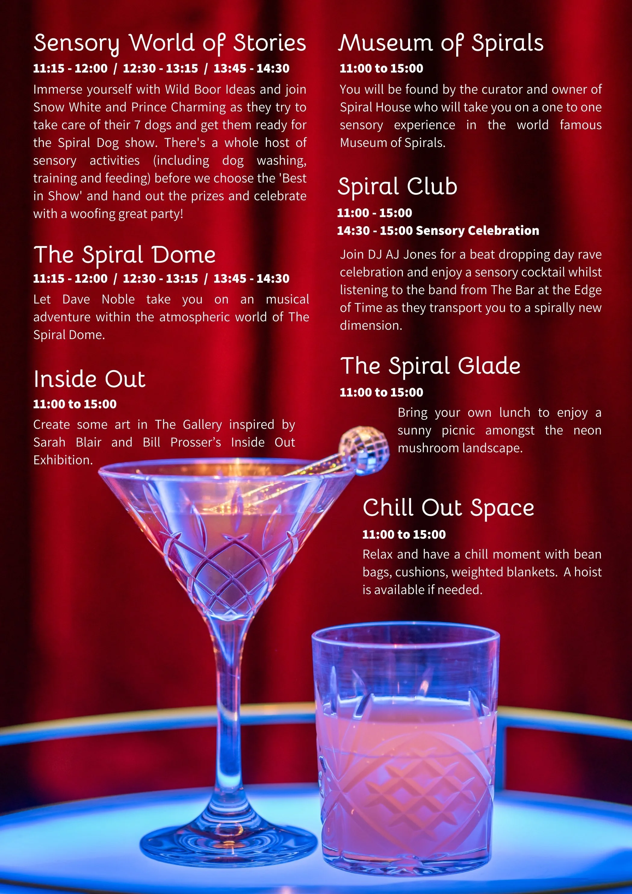 Follow your mood wherever it takes you, be that the comfort of the cocktail bar, the chill out area, the quiet of a sensory story or the heart of the party. In Spiral House you can be who you want to be and do whatever you need to do.